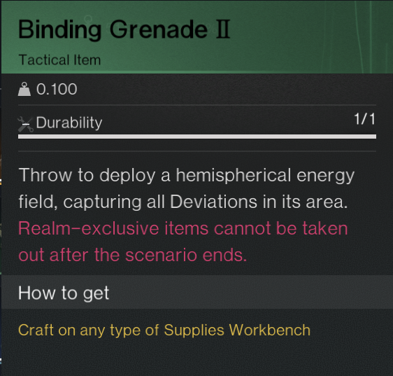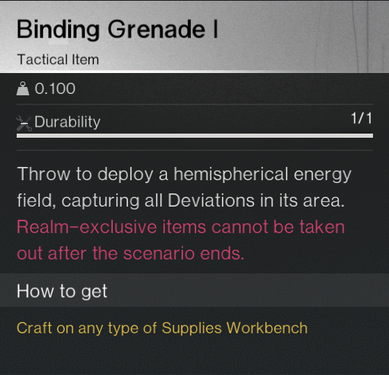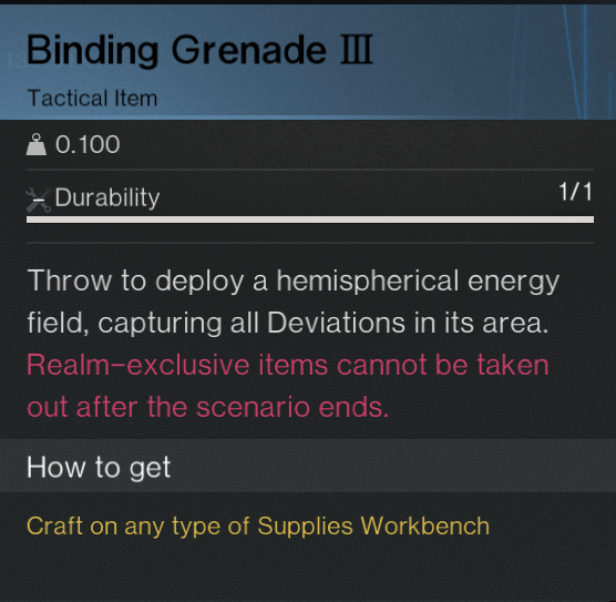 - Bring over enough tungsten or aluminum to create Tier IV and Tier V binding grenades (what you use to capture the deviations in the wild). You want to capture the highest level Deviations possible to improve chances in the wild and in the Chaos Arena Bosses.